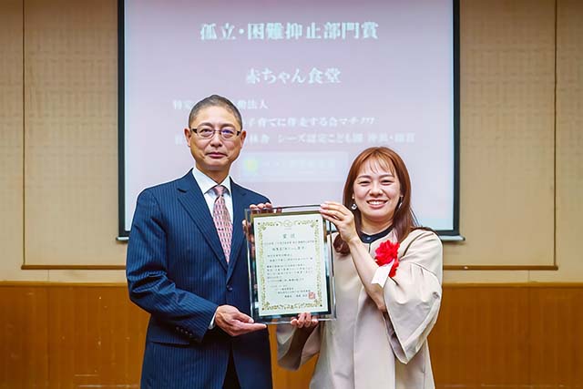 NPO法人とこども園の2者が連携してこども園を会場に保育士や管理栄養士とともに離乳食期の親子が安心して食事を楽しめる「赤ちゃん食堂」を開催。無料で離乳食とおとなの食事を提供し、育児相談や親同士の交流を通じて親の負担や孤立を軽減を目指す。離乳食づくりの参考にもなり、親子の笑顔が広がる時間となっている。