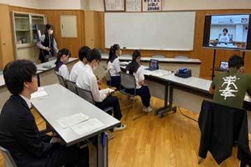 ▲2つの中学校の合同授業(中学2年生総合学習)